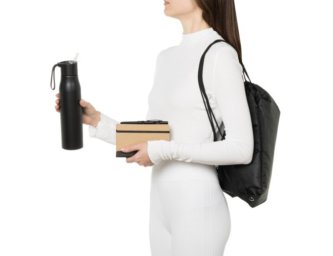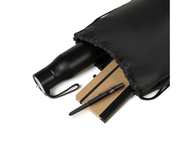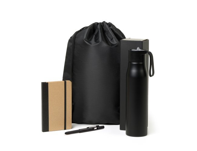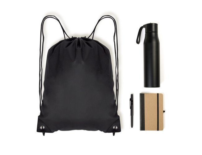 Composto por garrafa em alumínio reciclado na cor preta; mochila sacola preta em Nylon 190D com alças ajustáveis; caderno para anotações com capa dura nas cores Preto/Bege e caneta esferográfica em ABS preta.
